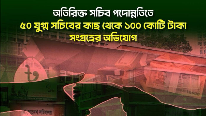 তদন্ত সূত্রে আরও জানা গেছে, অন্তত ৫০ জন যুগ্ম সচিবের কাছ থেকে প্রায় ১০০ কোটি টাকা সংগৃহীত হয়েছে। এই অর্থের বিনিময়ে তাদের অতিরিক্ত সচিব পদে পদোন্নতির আশ্বাস দেওয়া হয়েছে। ইতোমধ্যে পদোন্নতি সংক্রান্ত ফাইল প্রধান উপদেষ্টার দপ্তরে পাঠানো হয়েছে এবং যেকোনো সময় তা অনুমোদন পেতে পারে।