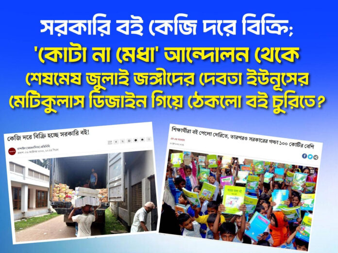 প্রথমেই আসি ইউনূস প্রশাসনের বই চুরি ও ব্যবসা চক্রের সাম্প্রতিক খবরে- এ বছরের শুরুর দিকের কয়েক মাস বাচ্চারা নতুন বই হাতে না পেলেও এবার শোনা যাচ্ছে অন্যখবর। বই ঠিকই ছিলো কিন্তু সংকট দেখিয়ে সরকারিসহ নিবন্ধনকৃত বেসরকারি শিক্ষাপ্রতিষ্ঠান কিন্ডারগার্টেনে শিক্ষার্থীদের বঞ্চিত করে স্টক করে রাখা হয়েছিলো বইগুলো। দৈনিক যুগান্তরের বরাতে জানা গেছে, ময়মনসিংহের নান্দাইল উপজেলায় স্টকে থাকা প্রাক-প্রাথমিক ও প্রাথমিক পর্যায়ের সরকারি পর্যাপ্ত নতুন বই কেজি দরে বিক্রি করা হচ্ছে।