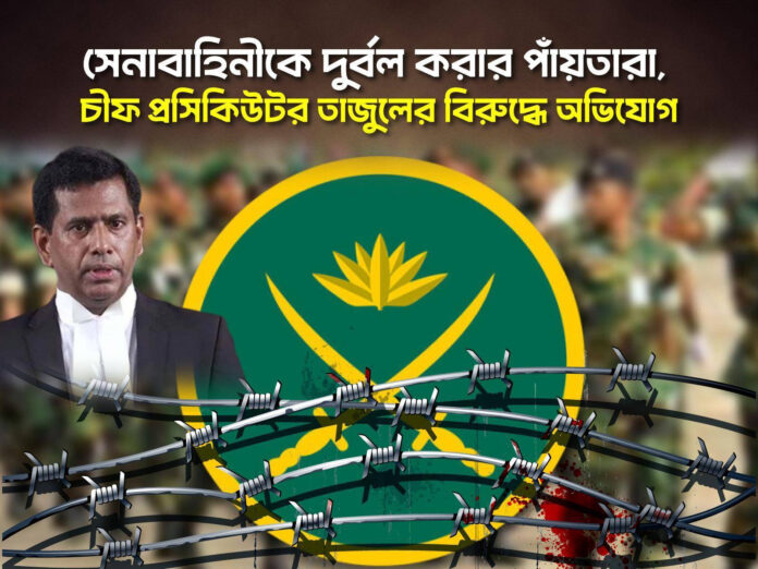 বাংলাদেশের বর্তমান রাজনৈতিক প্রেক্ষাপটে এমন এক গুরুতর অভিযোগ উঠেছে, যা রাষ্ট্রের নিরাপত্তা ও সংবিধানিক ভারসাম্যের জন্য গভীর উদ্বেগের কারণ হয়ে দাঁড়িয়েছে। অভিযোগ করা হচ্ছে অবৈধ সরকারের নিয়োগপ্রাপ্ত চীফ প্রসিকিউটর তাজুল ইসলাম সেনাবাহিনীর ভাবমূর্তি নষ্ট ও তাদের চেইন অব কমান্ড দুর্বল করার ষড়যন্ত্রে লিপ্ত।
