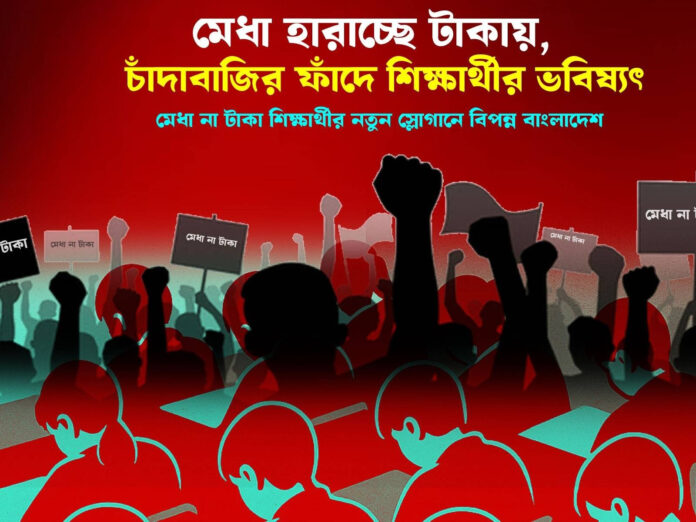বাংলাদেশের শিক্ষাব্যবস্থায় এ এক গভীর সংকট। এখানে আর মেধা বা পরিশ্রমের মূল্য নেই বরং মূল্যায়িত হচ্ছে টাকার ক্ষমতা, সামাজিক যোগাযোগ আর রাজনৈতিক আনুগত্য। শিক্ষাপ্রতিষ্ঠানের ছাত্রসংগঠনগুলো এখন প্রায়ই শিক্ষার চেয়ে চাঁদা তোলায় বেশি মনোযোগী। ফলাফল একটাই সৎ ও মেধাবী শিক্ষার্থীরা নিরুৎসাহিত হচ্ছে, অন্যদিকে প্রভাবশালীরা দখল করছে নেতৃত্ব ও সুযোগের আসন।