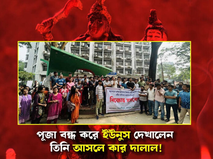 প্রথমে মৌখিক অনুমতি দিয়ে পরে নিরাপত্তার দোহাই দিয়ে সেটা তুলে নেওয়া। এই নিরাপত্তা সমস্যা কোত্থেকে এলো? মুসলিম ছাত্রছাত্রীরা কি আপত্তি করেছে? তারা তো বরং সমর্থন দিচ্ছে, একসাথে দাঁড়িয়েছে। তাহলে সমস্যাটা কার? যারা সাম্প্রদায়িক বিভাজন চায়, যারা হিন্দু-মুসলিম দাঙ্গা বাঁধিয়ে নিজেদের রাজনৈতিক ফায়দা লুটতে চায়, তাদের। আর সেই কাজটা করছে জামায়াত ও তাদের দোসররা ইউনুস সরকারের ছত্রছায়ায় বসে।