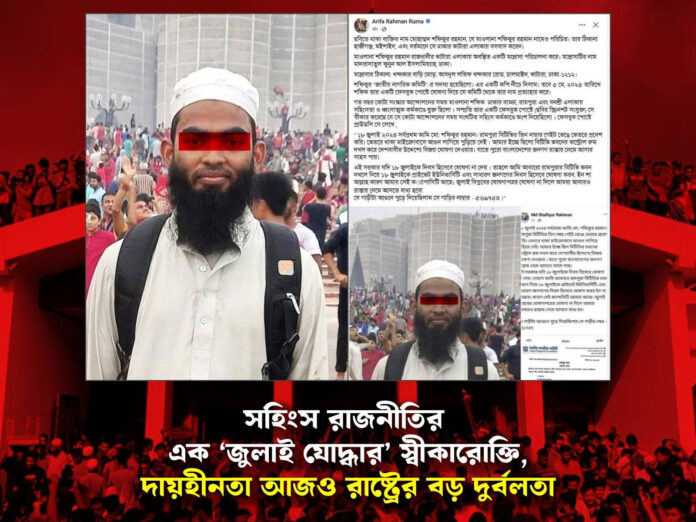 ‘জুলাই যোদ্ধা’ পরিচয়ে শফিকুর রহমান নামের এক ব্যক্তি নিজের ফেসবুক পেজে দেওয়া দীর্ঘ পোস্টে স্বীকার করেছেন—তিনি জুলাই আন্দোলনের সময় বিএনপি ও জামায়াতের কাছ থেকে অর্থ ও অস্ত্র সহায়তা পেয়েছিলেন। তাঁর দাবি অনুযায়ী, আন্দোলনের নামে সংঘটিত নাশকতার পেছনে ছিল একটি সংগঠিত নেটওয়ার্ক, যেখানে ছাত্রদল ও ছাত্রশিবির মানববল, পরিকল্পনা ও লজিস্টিক সহায়তা প্রদান করেছিল।